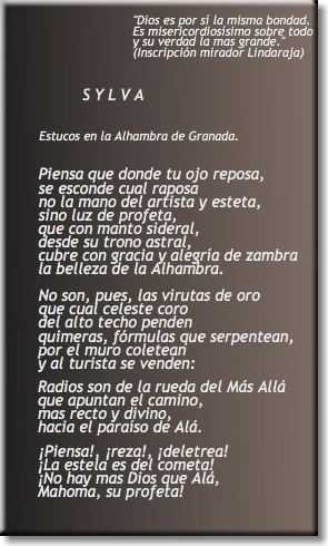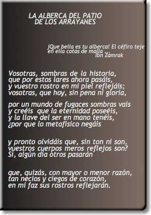 Estos versos nacieron como nacen las centellas o el alegre chisporroteo de la fogata: se despredieron espontaneamente, en un instante de las fuentes, jardines, estucos y entorno de esta obra maravillosa que es la Alhambra. Nacieron fruto de una visita a esa genial obra poética encuadernada de piedra y estuco.
